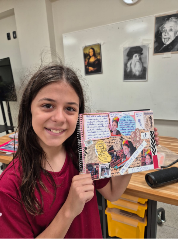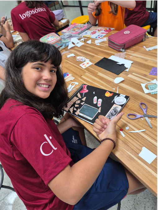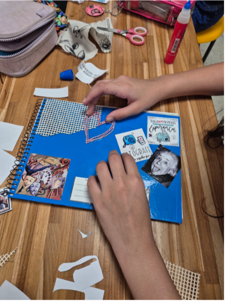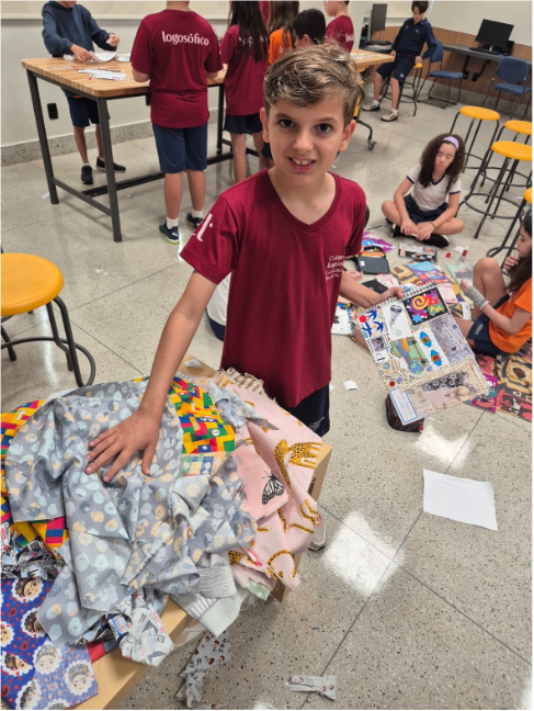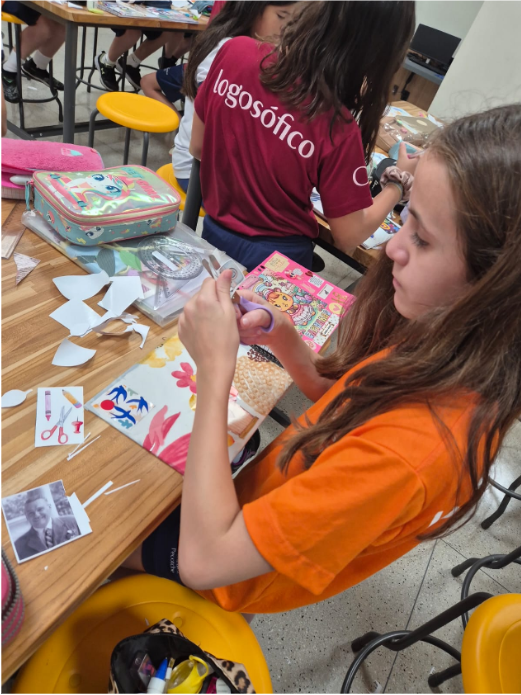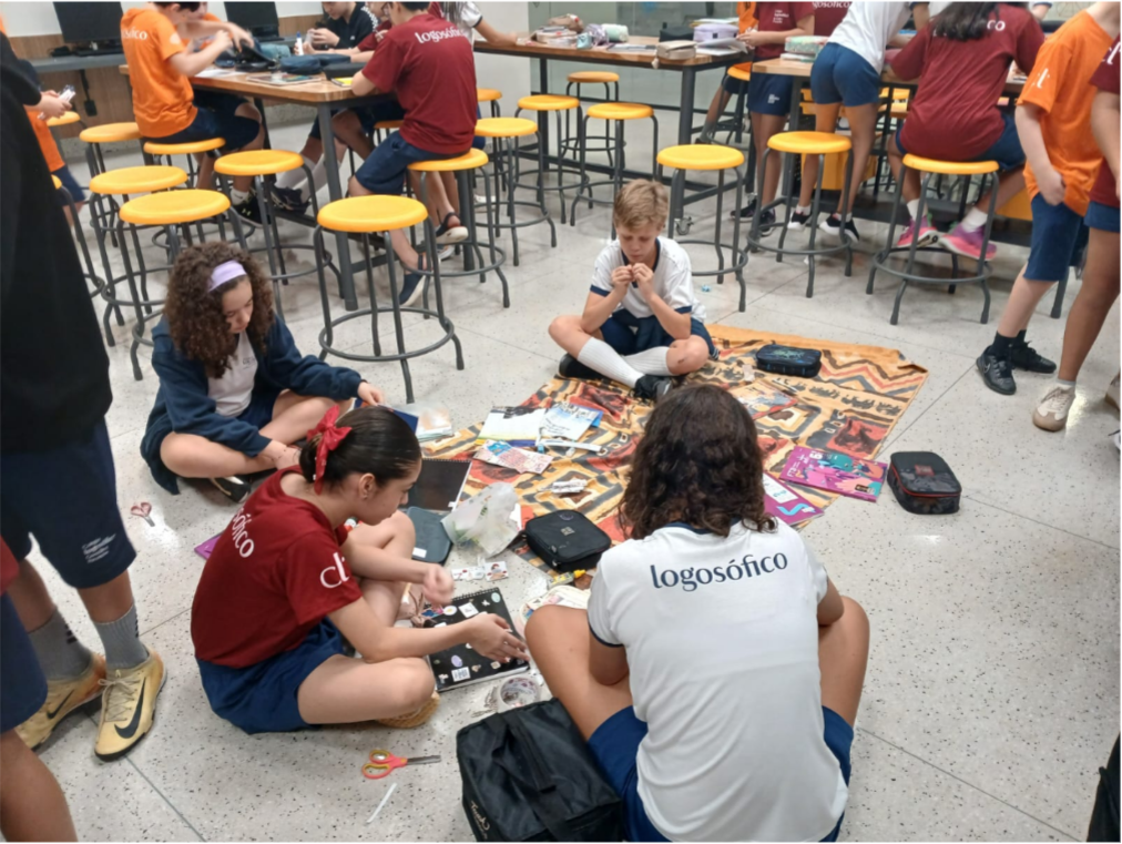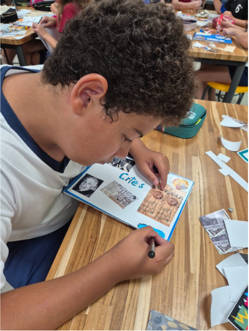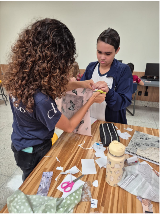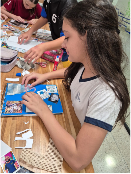 A proposta convidou os estudantes a criarem suas próprias capas utilizando diferentes materiais artísticos, como papéis coloridos, adesivos, tecidos e tintas, estimulando a criatividade e a autoexpressão. No 6º ano, a atividade foi desenvolvida a partir do tema “Caçadores de Arte: Linguagens artísticas como força para o bem”, incentivando a investigação sobre como a arte pode atuar como um instrumento de transformação positiva. Já no 7º ano, com o tema “Ver, sentir e agir: forças do bem na fotografia e no cinema”, os alunos foram conduzidos a refletir sobre o papel das imagens na formação de pensamentos e atitudes.
