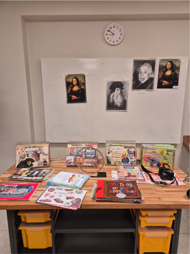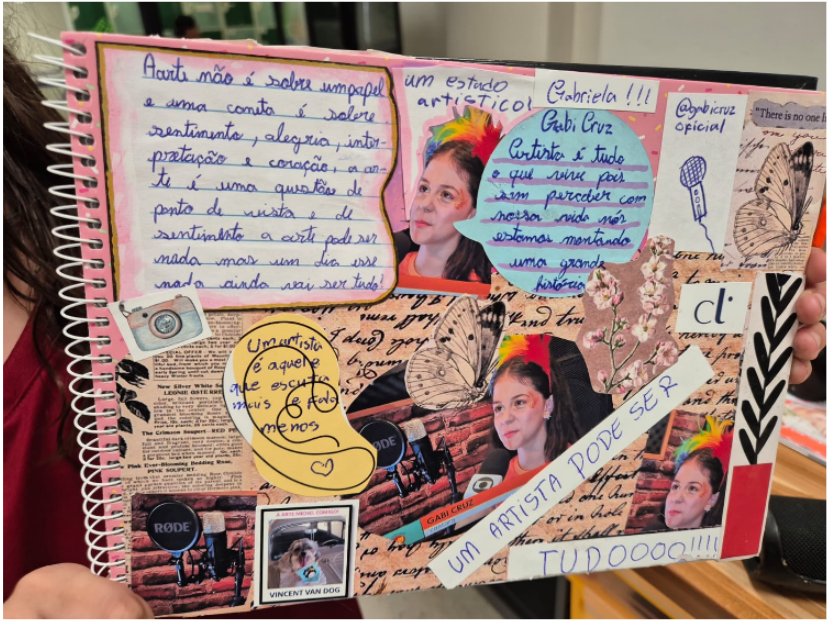 Ao longo do processo, os estudantes não apenas produziram suas capas, mas também participaram de momentos de reflexão e socialização, compartilhando suas escolhas, técnicas e significados atribuídos às produções. A proposta incluiu ainda registros no Caderno de Artista, experimentações com diferentes linguagens, observação de obras e momentos de reflexão sobre pensamentos e sentimentos, favorecendo o desenvolvimento da percepção estética e da consciência sobre o próprio processo criativo.